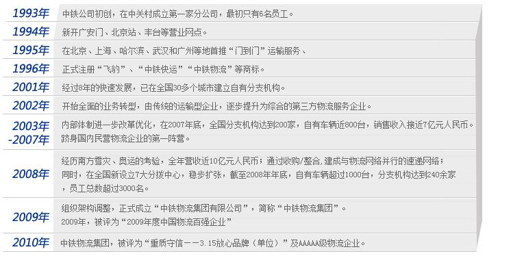 中铁物流集团有限公司(以下简称"中铁物流集团"或"集团"),创立于1993年,前身为"北京中铁快运有限公司"。经过多年的持续发展,迄今,已在全国范围内建成集公路、铁路、航空等多种运力于一体的全国性物流网络,培养了一大批专业的物流人才。